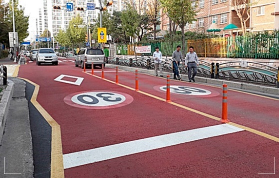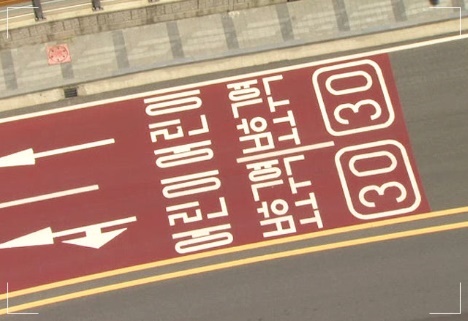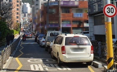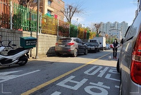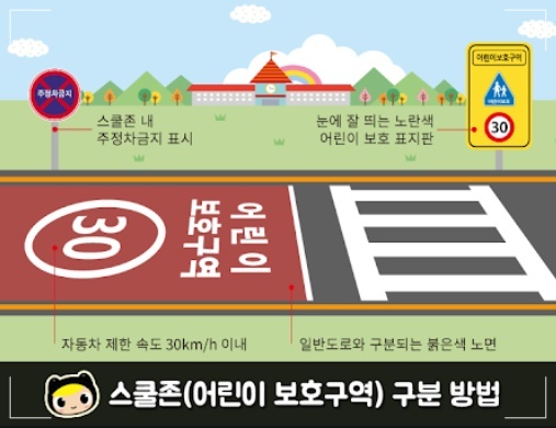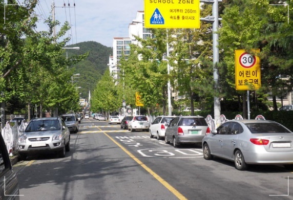 사진에는 특히 어린이보호구역 및 주정차 금지를 알리는 황색 실선이나 표지판 등 안전표지가 나타나야 합니다.