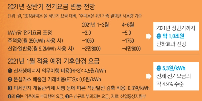 지난해 4인 가구의 평균 한 달 전기요금(350㎾h 기준)은 5만5,080원입니다. 새롭게 바뀐 연료비 조정 요금을 반영하면 올해 1~3월 주택용 전기요금은 평균치보다 1,050원을 덜 내게 됩니다. 4~6월의 경우 할인액이 최대 1,750원으로 늘어날 전망입니다.