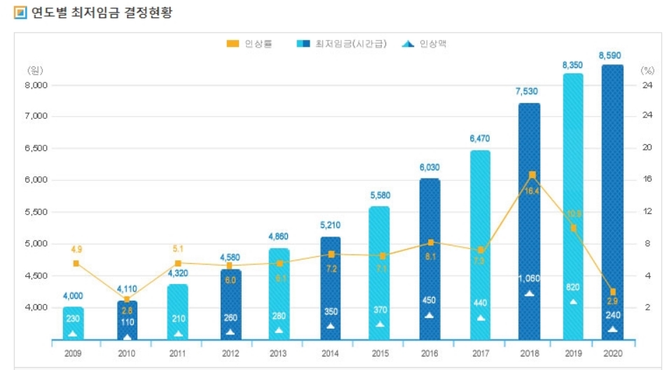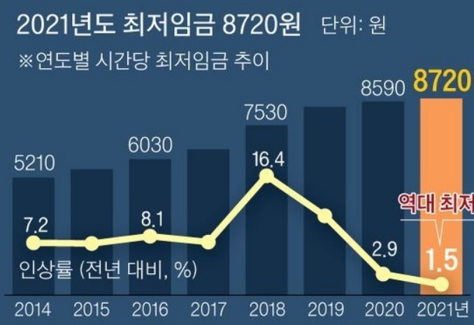 2021년에는 역대최저 상승률인 1.5% 상승하여 130원 오른 8,720원으로 기존에 2019년 8,590원에 비해 130원 오른 금액입니다. 2019년 대비 2020년 최저시급이 2.9% 인상되었던 것에 비하면 인상률이 많이 낮습니다.