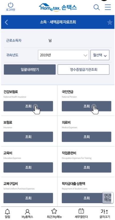 손택스로 불리는 국세청 홈택스 앱을 깔고 공인인증서나 금융인증서로 로그인 하면 PC에서와 마찬가지로 연말정산 간소화서비스를 이용할 수 있습니다. 접속 후 연말정산 공제신고서 작성하기에 들어가서 기본 개인정보와 근무지 정보를 입력하면 각종 소득공제 자료를 불러올 수 있습니다.