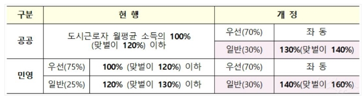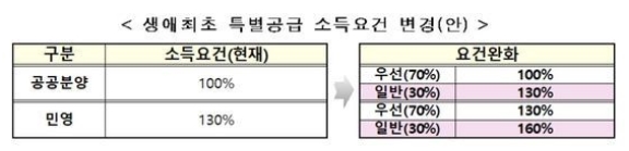 생애최초 특별공급 소득요건도 완화됩니다. 국토부는 생애최초 특공을 우선공급(70%)과 일반공급(30%)으로 나눠 차별화된 소득 기준을 적용하기로 했습니다.