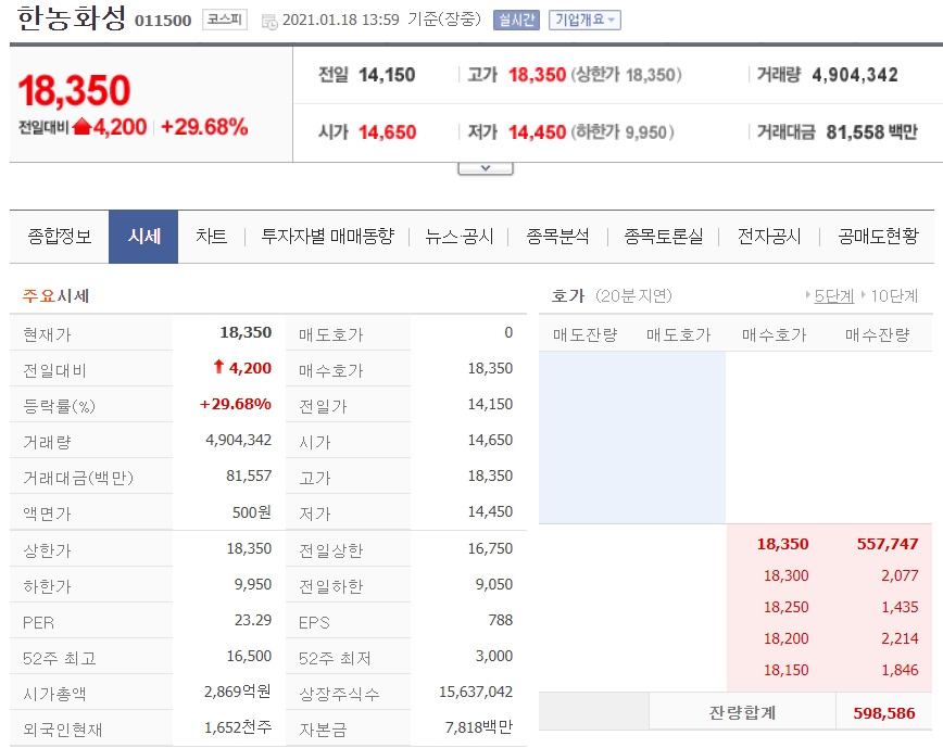 한농화성의 시가총액은 2869억원으로 코스피종목에 포함되어있는 주식으로 52주 최고가는 18,300원이며, 최저점은 3000원입니다. 1년사이에 저점대비 약 6배 상승했습니다.