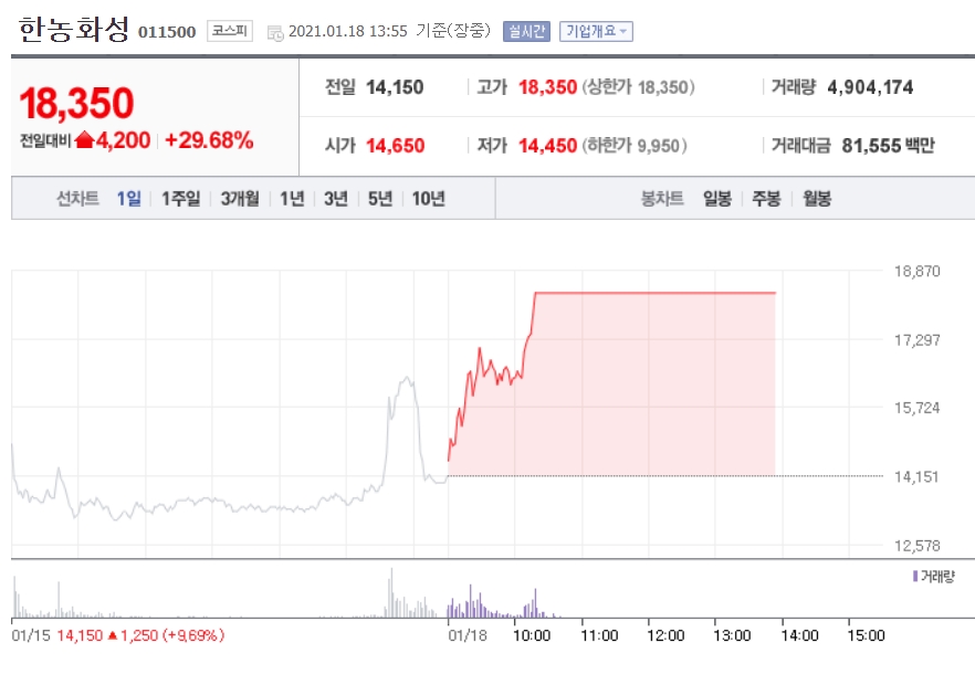 한농화성이 오전 중 상한가를 달성했습니다. 18일 코스피 시장에서 한농화성은 10시 41분 현재 전 거래일보다 29.68%(4200원) 오른 1만8350원에 거래 중입니다.