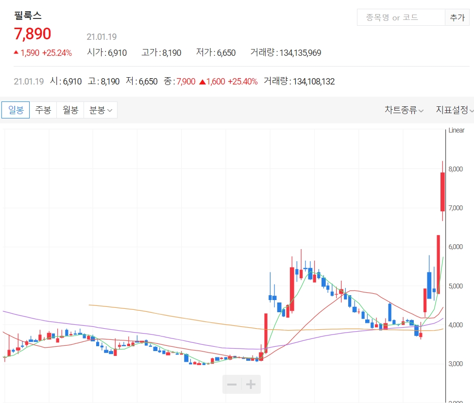 필룩스가 지난 13일과 18일 상한가를 기록한 바 있으며 이날 오전 10시 현재 전 거래일보다 20%(1260원) 상승한 7560원을 기록 중입니다. 지난 12일과 대비하면 약 2배 가량 주가가 상승했으며 상한가 한번을 포함해 사흘째 오름세입니다.