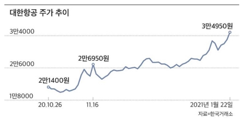 대한항공 주가는 지난 22일 종가 기준 3만4950원으로, 아시아나항공 인수를 발표한 지난해 11월 16일(2만6950원)과 비교하면 두 달 동안 약 29.68% 상승했습니다. 대한항공이 3만4000원대를 회복한 것은 2019년 4월 이후 처음입니다.