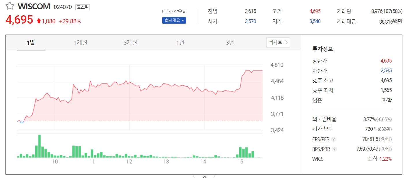 WISCOM(위스컴)의 주식이 연일 상승하고 있습니다. WISCOM은 금일 전일대비 29.88% 상승한 4,695원에 장을 마감하였습니다. WISCOM은 오늘상한가를치며 시가총액 720억 코스피 882위로 올라왔습니다.