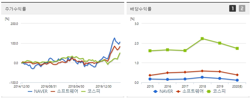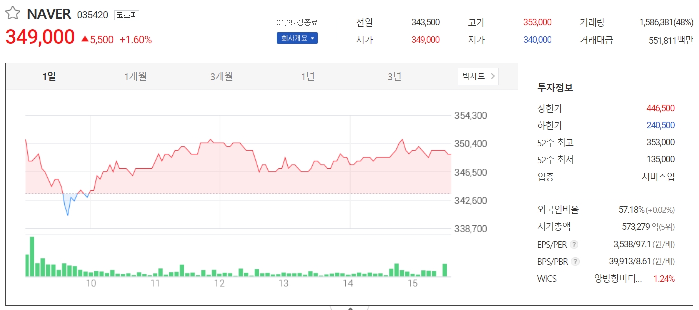 네이버는 올해 주가 상승률(22일 기준)이 각각 17.4%를 기록했습니다. 22일에는 네이버가 전거래일 대비 6.51% 뛴 34만3500원에 거래를 마치며 종가 기준 최고치를 기록했으며 25일 오후 1시38분 기준 전거래일 대비 각각 1.16%, 상승률을 나타내며 강세를 이어가고 있습니다.