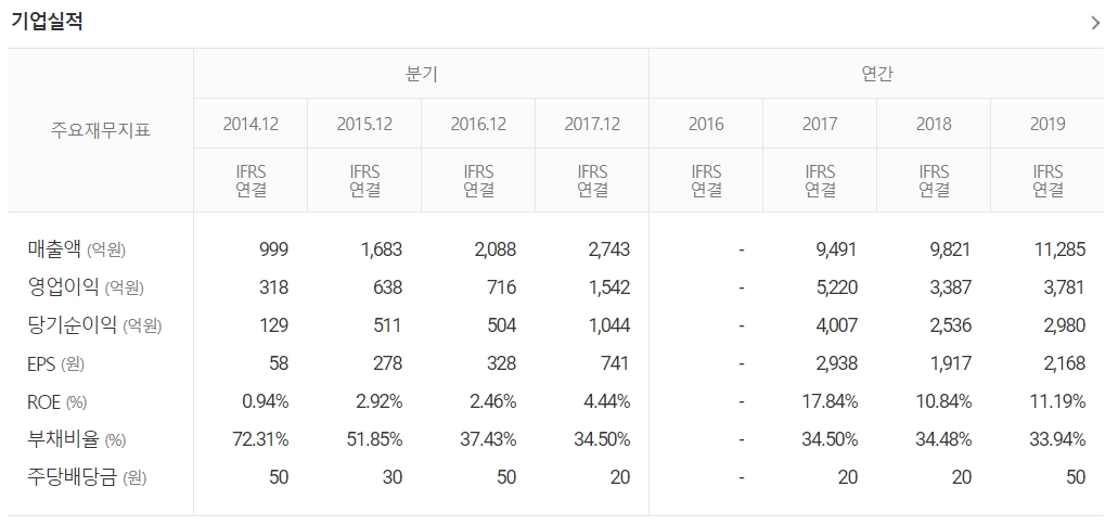 지난 3분기 실적은 매출액 5500억원으로 전년대비 90%나 증가했으며 영업이익 2500억원으로 작년대비 138% 나 증가함으로써 역대 최고 분기실적을 기록했습니다.