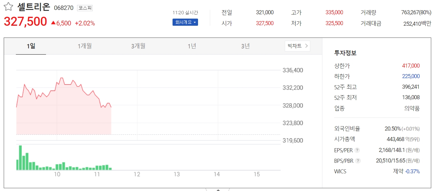 한국거래소에 따르면 셀트리온은 오전 9시 25분 현재 전일 대비 3.43% 급등한 33만2000원에 거래 중입니다. 같은 시각 셀트리온헬스케어는 3.22% 뛰어오른 15만7300원, 셀트리온제약은 4.72% 급등한 19만3000원을 각각 기록 중입니다.