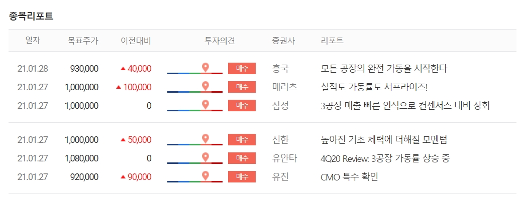 이에 투자의견은 ‘매수’를 유지하고 목표주가는 종전 95만원에서 100만원으로 5.26% 올려 잡았습니다. 이베스트투자증권 110만 원, 메리츠증권 100만 원, 키움증권 98만 원으로 모두 목표가를 올렸습니다.