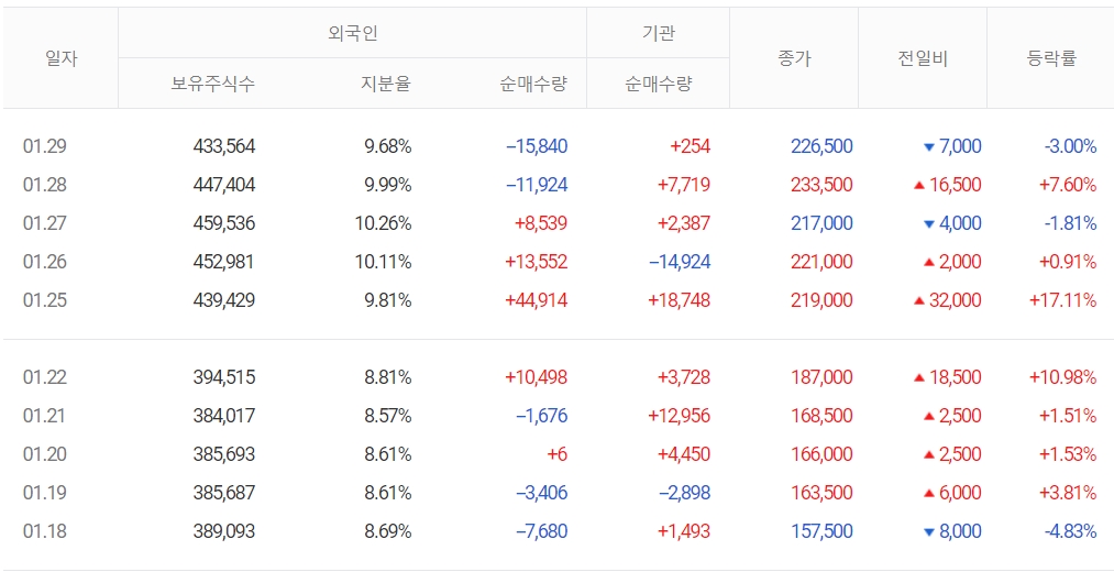 반면 개인들은 12.9만주를 순매도한 것으로 나타났습니다. 같은 기간 이 종목의 거래비중은 외국인과 개인이 각각 12.9%, 82.3%로 비중이 높습니다. 한편 기관은 이 종목에 대해서 최근 3일 연속 1.0만주 순매수를 하고 있습니다.
