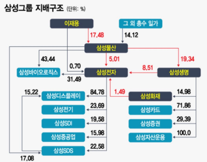 삼성물산의 현재 가장 큰 호재는 삼성전자의 지분을 보유하고 있다는 것과 상속세를 충당하기 위해서 배당금을 상향 지급 할 수 있다는 점입니다. 삼성전자의 지분은 삼성물산이 5% , 삼성생명이 8%로 삼성물산은 삼성생명의 주식을 19% 보유하고 있습니다.