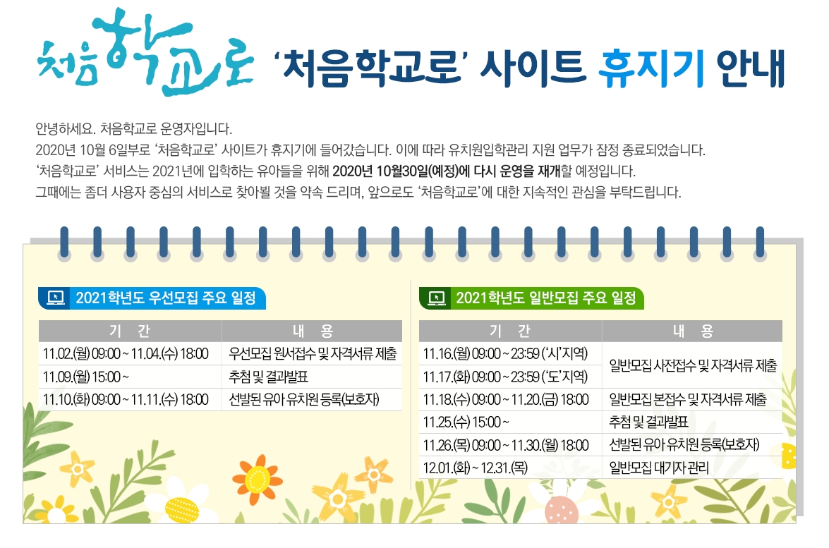 교육부는 2021학년도 유치원 입학을 위한 ‘처음학교로’(www.go-firstschool.go.kr) 학부모 서비스를 30일 시작한다고 16일 밝혔습니다.