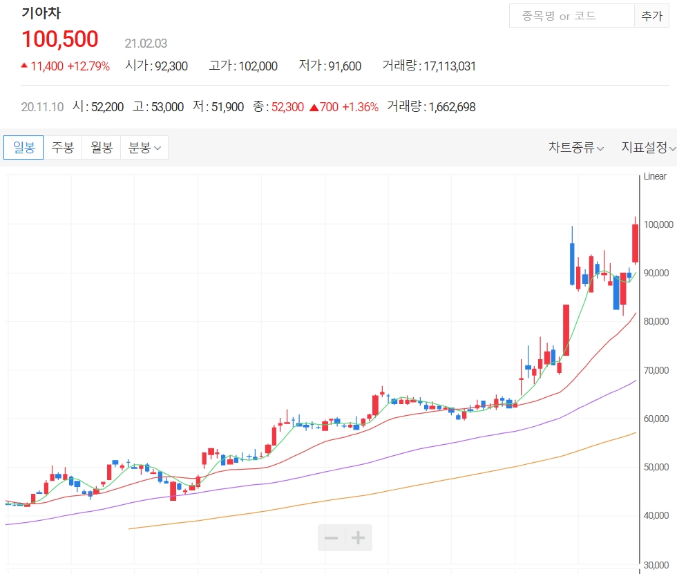 기사가 나온 후 현대차그룹에서는 애플이 미래차를 위한 협력계약을 추진한다는 보도에 대해 결정된 바 없다는 입장을 밝혔으나 투자심리는 줄어들지 않고 오름세를 유지하고 있습니다.