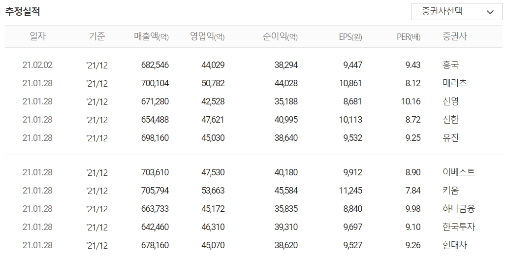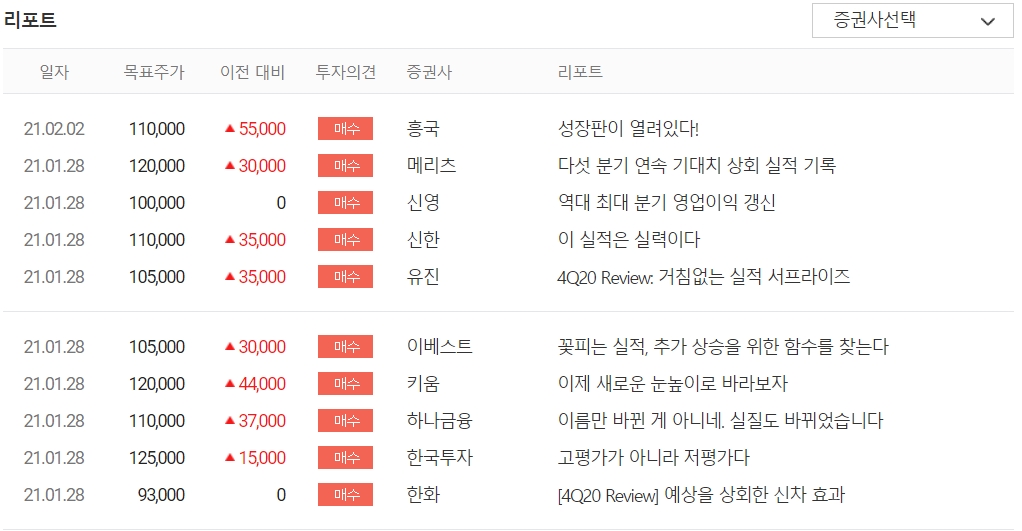 증권사들은 투자의견 'BUY',로 흥국증권(11만원), 유진투자증권(10만5천원), 키움증권(12만원), 신한증권(11만원), 메리츠증권(12만원)에 제시했습니다.