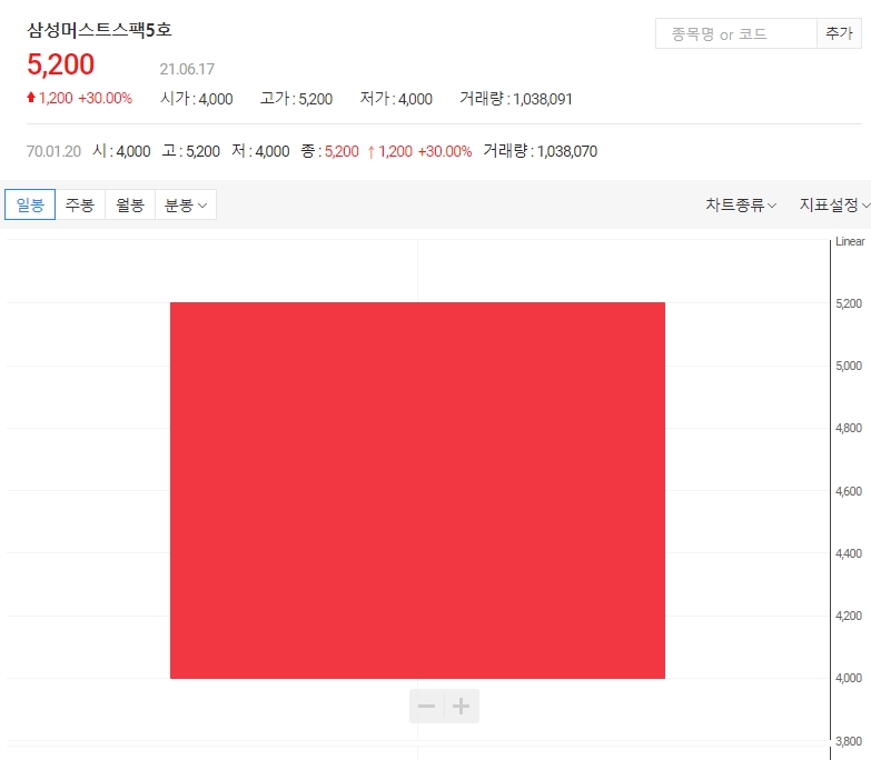 삼성머스트스팩5호는 17일 개장 3분만에 시초가대비 30% 오른 5200원으로 직행했습니다. 시초가는 스팩 기준가인 2000원의 2배인 4000원에 결정됐습니다. 이 스팩은 청약 경쟁률 900대 1을 넘기며 스팩 중 이례적으로 높은 청약 열기를 기록한 바 있습니다.