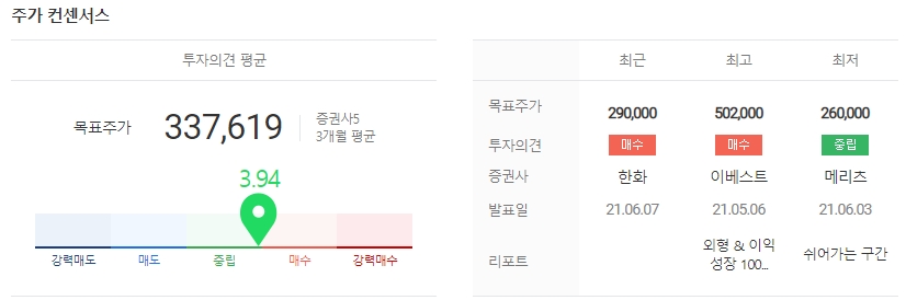 하이브의 목표주가는 증권사마다 제각각입니다. 이베스트투자증권은 지난달 하이브에 대해 목표주가 50만2000원을 내놓았으나 메리츠증권은 26만원을 제시했습니다. 하지만 증권사의 평균 목표주가는 34만원대로 현재 주가 대비 11% 가량 상승 여력이 남았다고 전망하고 있습니다.