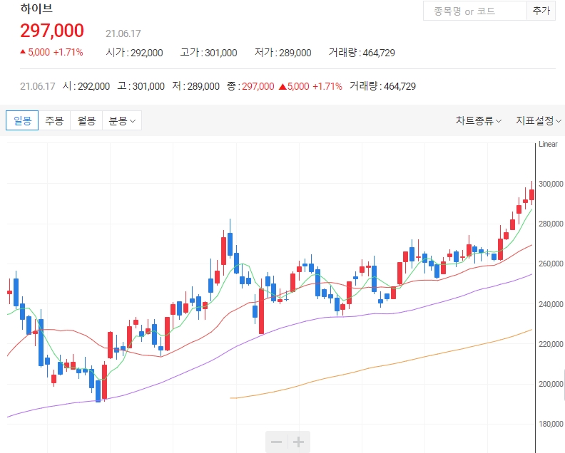 17일 한국거래소에 따르면 하이브 는 이날 오전 10시30분 현재 전 거래일 보다 6000원(2.05%) 오른 29만8000원에 거래되고 있습니다. 지난 10일 종가 기준으로는 처음 27만원대(27만2500원)에 오른 데 이어 5거래일 연속 상승하며 신고가를 갈아치우고 있습니다.