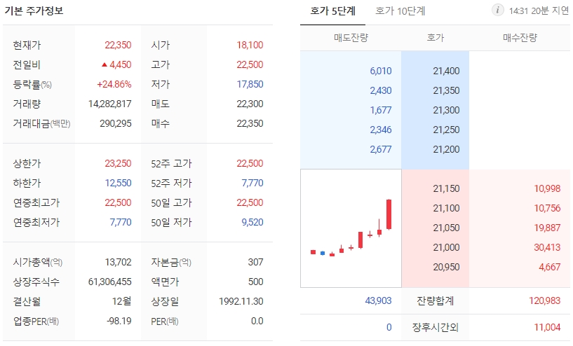 18일 한국거래소에 따르면 네이처셀은 오전 10시 37분 기준 전 거래일 대비 9.78%(1750원) 오른 1만9650원에 거래되고 있습니다. 시장가격 기준 시가총액은 1조2047억원으로 코스닥 시장에서 53위입니다. 외국인소진율은 5.02%, 주가순자산배수(PBR)는 20.28배, 동일업종 PER은 -124.29배입니다.