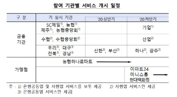 시스템 구축과 안정성 점검 및 시범서비스를 마친 SC제일, 농협, 제주, 농협중앙회, 수협, 수협중앙회, 우리, 대구, 전북, 경남은행 등 10개 금융기관을 중심으로 서비스가 시작됩니다. 이외 신한, 부산은행은 상반기중 기업, 산업, 하나, 광주은행은 하반기중 서비스를 시작할 예정입니다.