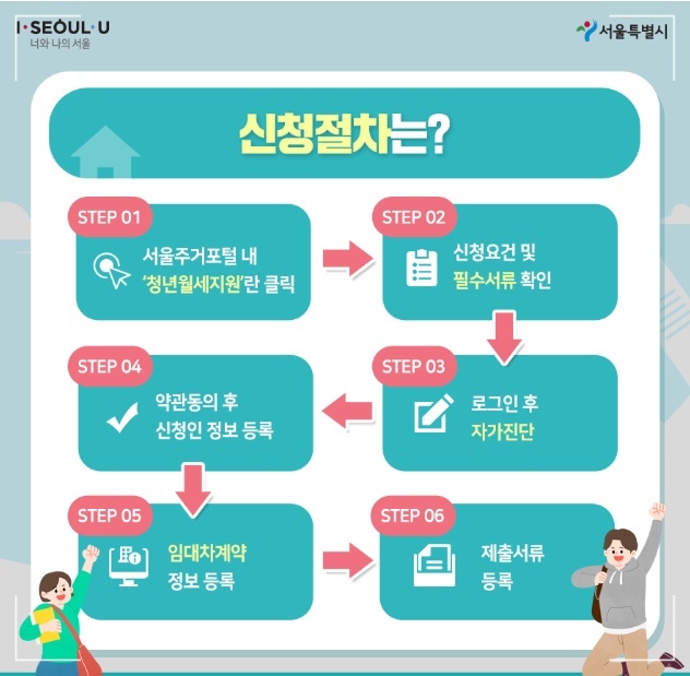 서울 청년월세지원 신청은 서울주거포털 http://housing.seoul.go.kr 에서 받습니다. 이후 소득재산 의뢰·조사를 거쳐 지원대상자를 발표하고 지원금 지급을 시작합니다.