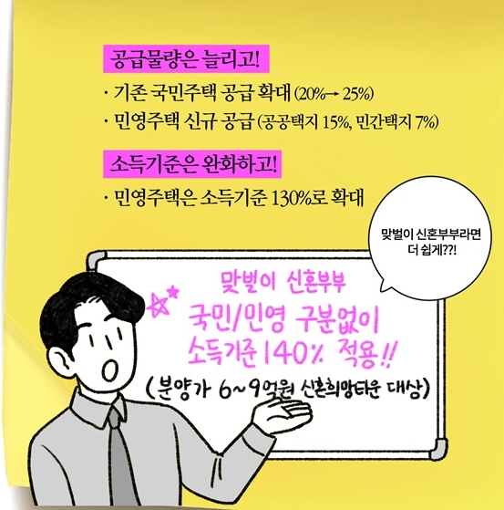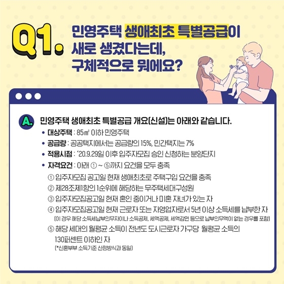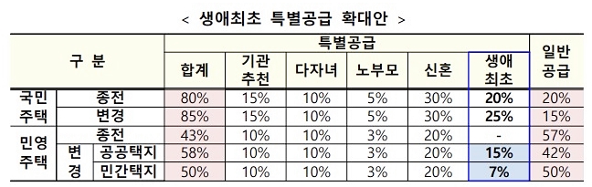 부동산정책의 변화로 집값이 점점 올라 내집 마련의 기회가 점점 힘들어 지고 있습니다. 정부에서는 새롭게 정책을 변화시켜 기회를 확대하고 있는데 기존에는 생에최초 특별공급이 국민주택에만 적용이 되었으나 변경 후 민영주택도 도입이 되어 관심이 증가하고 있습니다.
