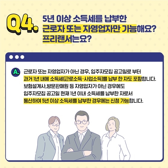 근로자 혹은 자영업자 신분으로 5년간 소득세를 납부한 이력이 있어야 합니다. 아르바이트를 통한 소득세 납부도 인정이 되며 연속으로 납부하지 않고 5년동안 중간중간 납부했더라도 신고 내역이 있다면 가능합니다.