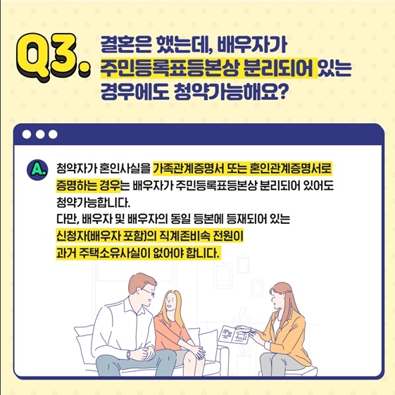 결혼을 하였거나, 자녀를 출산한 경우에 신청 조건에 부합합니다. 혼인을 한 상태이거나 만약 이혼을 했을시 자녀의 양육권을 갖고 같이 거주하는 경우에는 가능합니다.