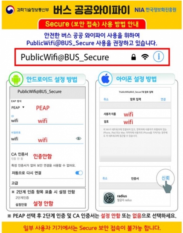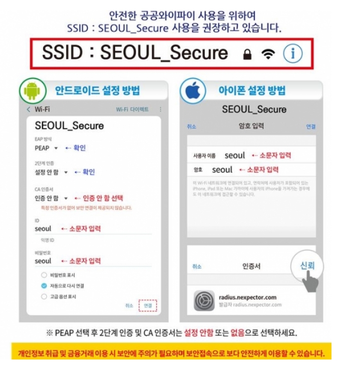 보안접속은 스마트폰 설정에서 와이파이 식별자(SSID) 'SEOUL_Secure'를 선택 후 ID 'seoul', 비밀번호 'seoul'을 입력하면 됩니다. 다만 시내버스 와이파이는 안정적인 데이터 이용을 위해 'Public WiFi@Bus_Secure_(노선번호)'로 운영됩니다.