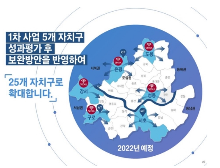 아울러 자가통신망을 활용한 공공 사물인터넷(IoT)망 시범 서비스도 내년부터 구로·서초·은평구 등 3개 자치구에서 시작할 예정입니다.구로구는 '맞춤형 스마트 보안등 확대', 서초구는 '인공지능(AI) 기반 미세먼지 예·경보', 은평구는 '위험시설물 안전관리' 서비스를 시작합니다.