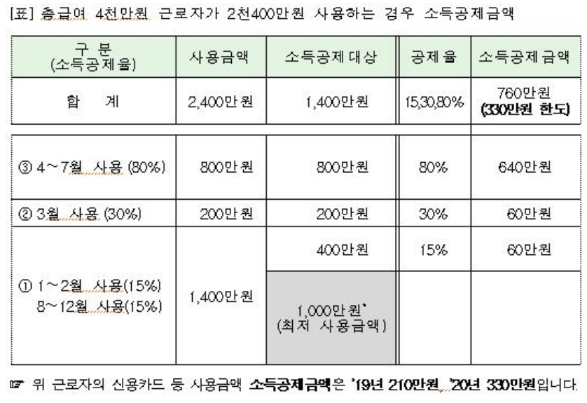 예로 총급여 4천만원이고 매달 100만원씩(전액 일반사용분으로 가정) 신용카드를 사용한 직장인 A씨의 올해분 신용카드 소득공제금액은 160만원으로, 작년 귀속분보다 소득공제금액이 130만원이나 늘어납니다.