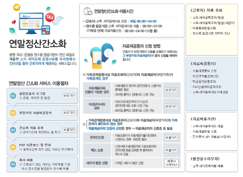 국세청이 오픈한 연말정산 간소화서비스는 근로자가 연말정산 신고서를 작성할 때 필요한 소득・세액공제 증명에 필요한 자료를 국세청이 병원・은행 등 17만개 영수증 발급기관으로부터 직접 수집해 근로자에게 제공해 신청자가 편리하게 이용할 수 있습니다.