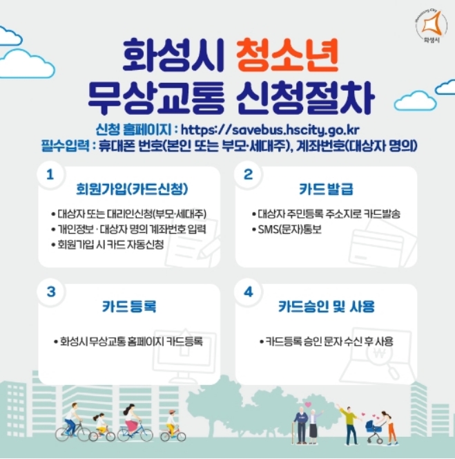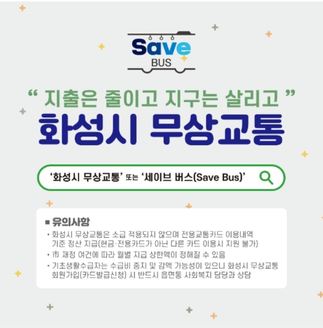 혜택을 받기 위해서는 먼저 화성시 무상교통 홈페이지savebus.hscity.go.kr/user/siteIntro/servicePage.do나 모바일 웹을 통해 전용 무상교통카드를 발급받아야 합니다. 해당 카드로 시내버스나 마을버스를 이용한 뒤 이용 금액을 지정된 계좌로 환급받는 방식입니다.