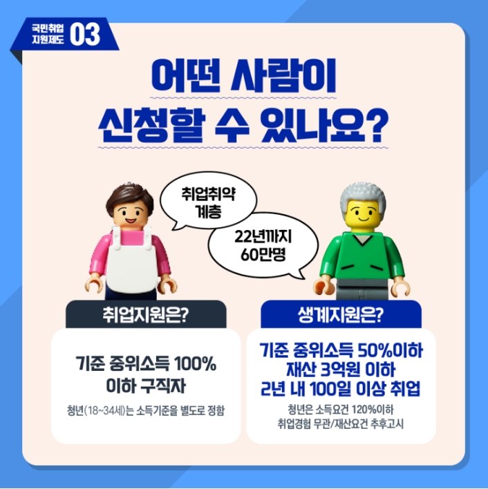 기존 제도인 ‘취업성공패키지’(중위소득 100% 미만 대상)에 소득 기준이 중위소득 50% 미만인 사람들에 대한 ‘요건심사형’과 ‘선발형’ 지원을 추가한 것이 특징입니다.