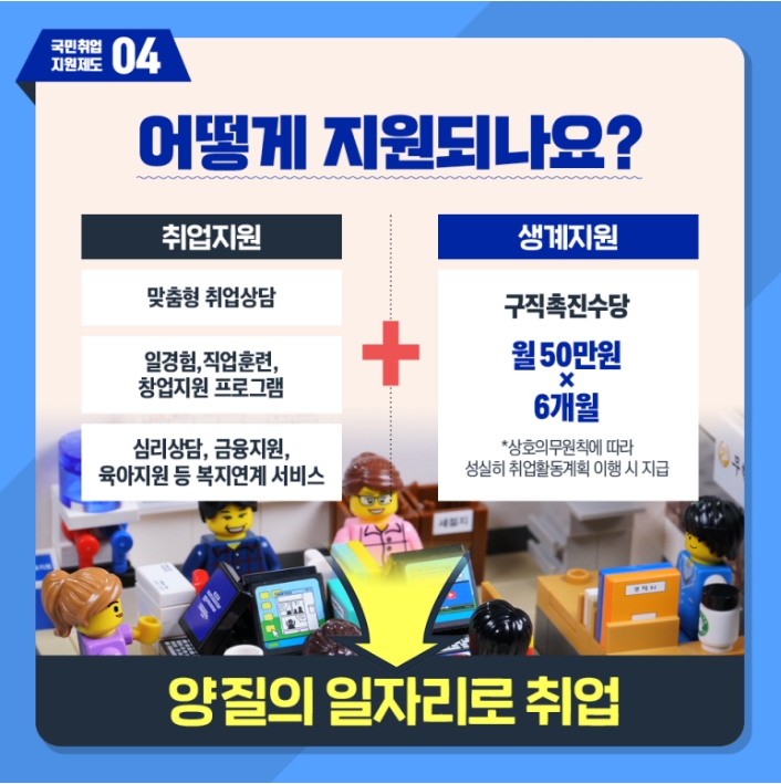 코로나19로 인해 경제가 침체화되면서 구직자들도 힘든 시간을 보내고 있습니다. 취업을 원하는 취업준비생들을 위해 국민취업제도가 실시됩니다. 취업을 준비하는 분들은 아래 내용을 참고 하시고 도움받으시기 바랍니다.