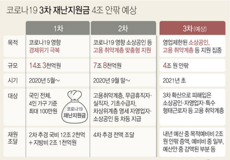 3차 재난지원급 지원이 공론화 되면서 3차 재난지원금의 지급대상에 대한 관심이 쏠리고 있습니다. 규모는 4조원대지만 전국민 대상이 아닌 선별지급이 될 것으로 보입니다. 아래 내용에서 3차 재난지원금에 대해 확인하시기 바랍니다.