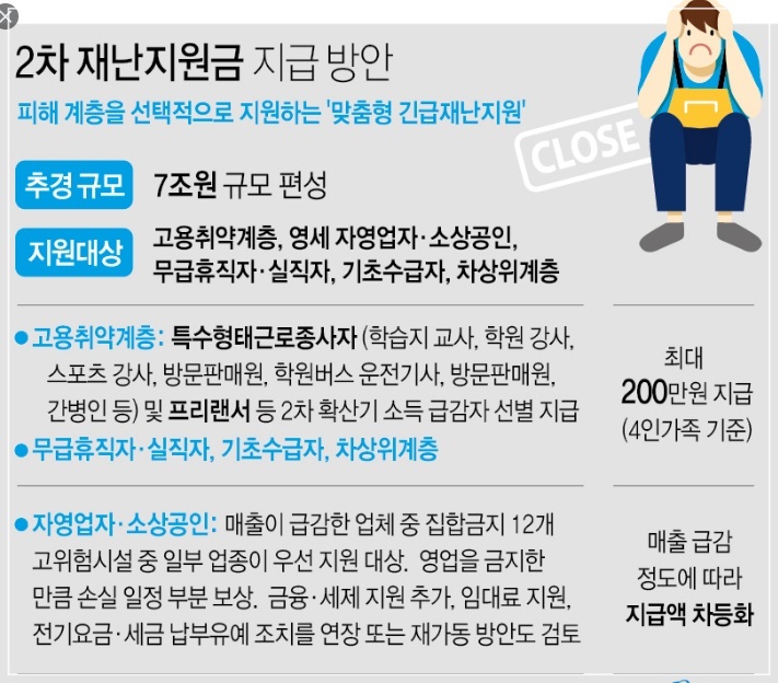 이번 2차 재난지원금은 1차에 전국민에게 지급한 재난지원금과 달리 자영업자와 소상공인, 저소득층과 같은 취약계층에게 집중적으로 지원됩니다. 소상공인을 위한 긴급고용안정 패키지, 저소득층 긴급생계 지원 패키지, 학부모를 위한 긴급 돌봄 지원 패키지 등이 지원됩니다.