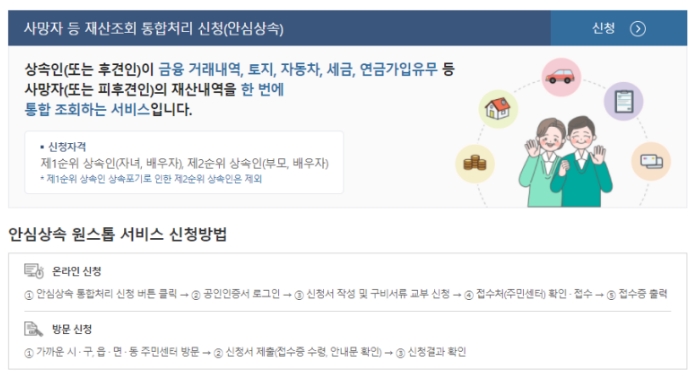 신청은 민법상 1순위 상속인이 가까운 구청이나 주민센터를 방문해 신청할 수 있고, 온라인신청도 가능하며 신청 후 문자·온라인·우편 등으로 결과를 확인할 수 있습니다.